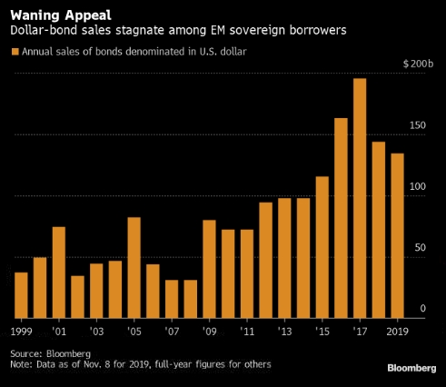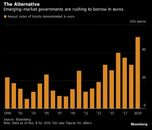 Популярность евро каквалюты-финансирования растет на развивающихся рынках, причем ежегодные продажи государственных облигаций впервые превысили 50-миллиардную отметку. Суверенные эмитенты привлекли 51.2 млрд евро ($56.4 млрд) в 2019 году, согласно данным, собранным Bloomberg, До конца года осталось семь недель, что уже превосходит предыдущий рекорд в 39.9 миллиарда евро, собранных за весь 2016 год. В годовом исчислении это означает увеличение выпуска новых облигаций на 80%. Сравните это с ростом на 2.7% эмиссии долларовых облигаций и станет очевидно, что евро отнимает долю рынка у американской валюты.