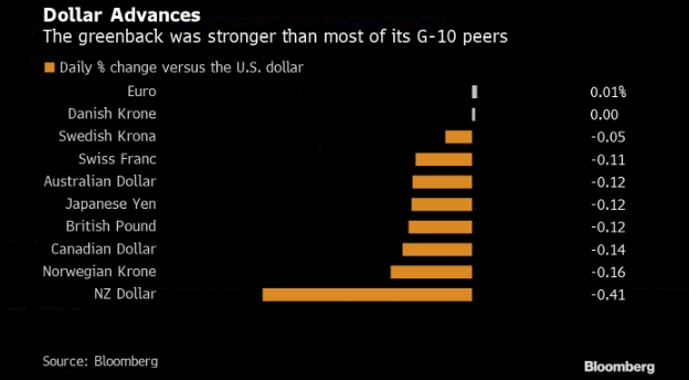 Во вторник доллар вырос по отношению к большинству валют из группы 10 ведущихиз-за умеренного риска на рынках, оказавшего давление на такие защитные инструменты, как иена и швейцарский франк. Новозеландский доллар упал после того, как данные показали снижение инфляционных ожиданий, что повысило ожидания снижения процентной ставки на этой неделе.