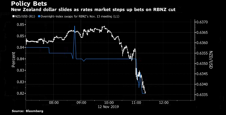 Самые большие потери против доллара были замечены у киви; NZD/USD упал на 0.6% до 0.6326. Свопы овернайт сигнализировали о 76% -м шансе снижения ставки Резервным банком Новой Зеландии против 64% в понедельник. РБНЗ снизит ставку до рекордно низких 0.75%, считают 15 из 21 экономистов, опрошенных Bloomberg.