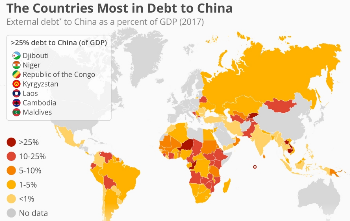 Долг семи стран перед Китаем превысил 25% их ВВП, говорится в недавнем отчете Кильского института мировой экономики (КИМЭ). Три из них (Джибути, Нигер и Республика Конго) находятся в Африке, а еще четыре (Киргизия, Лаос, Камбоджа и Мальдивы) — в Азии (см. иллюстрацию в начале статьи).