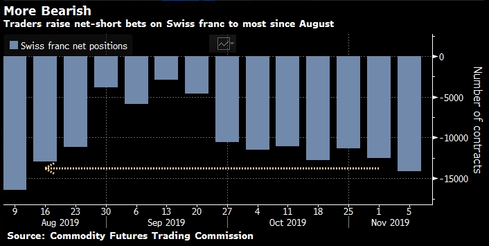 Данные по позициям Комиссии по торговле товарными фьючерсами показывают, что спекулянты и хедж-фонды с середины сентября становятся все более медвежьими по отношению к франку, хотя евро остается с самым большим шортом среди G-10.