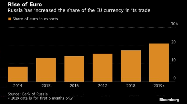 Генеральный директор Роснефти Игорь Сечин в прошлом месяце объявил, что компания перевела все свои экспортные контракты на евро, хотя доллары и рубли все равно будут использоваться в качестве резервного варианта. Экспортная выручка компании в 2018 году составила 94 миллиарда долларов, что составляет около 20% от общего российского объема. Газпром уже получает оплату за 44% экспортируемого газа в евро. Роснефть не ответила на запрос о комментариях относительно операций компании в евро.
