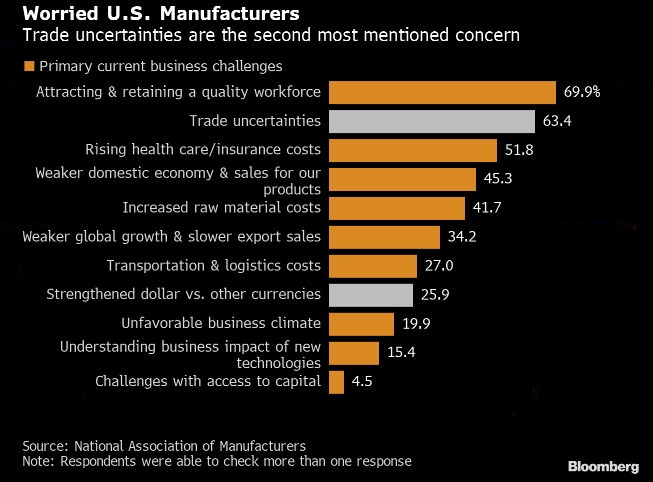 Последний квартальный опрос Национальной ассоциации производителей показал, что неопределенность в сфере торговли была второй по значимости проблемой в списке проблем, причем более 63% респондентов оценили ее как свою главную проблему. Растущий доллар занял восьмое место, только около 26% компаний указали на это.