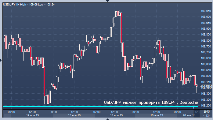 Доллар находится под понижательным давлением против иены, так как Китай вновь заявляет, что предпримет ответные меры, если США примут закон, направленный на поддержку протестующих в Гонконге, говорит Вако Огава, директор по продажам иностранной валюты в Deutsche Securities. Неопределенность усиливается, поскольку рынок начинает связывать торговые дела и протесты в Гонконге. USD/JPY может протестировать минимум прошлой недели 108.24, хотя пара может быть подкреплена оптимистичным настроением в отношении рынка акций США.