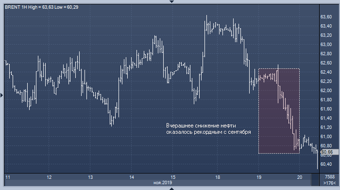 Вчера нефть Brent подешевела на 3%, что стало рекордным значением с конца сентября. Ночью Американский институт нефти (API) сообщил о том, что коммерческие запасы сырой нефти в США за неделю до 15 ноября выросли почти 6 млн баррелей. Если Минэнерго страны подтвердит эти данные, то это будет означать, что запасы растут уже четыре недели подряд.