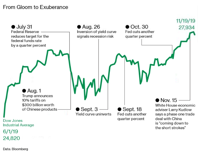 Геополитическая ситуация также немного стабилизировалась, начиная с лета. Торговая война не усилилась. Экономика Китая замедлилась, но она не рухнула. В Европе риск хаотичного, Brexit без сделки, уменьшился, в то время как данные третьего квартала показали, что Германия смогла избежать возможной первой рецессии за шесть лет. Morgan Stanley в своем отчете от 18 ноября написал, что «торговая напряженность и денежно-кредитная политика ослабляются одновременно впервые за семь кварталов».