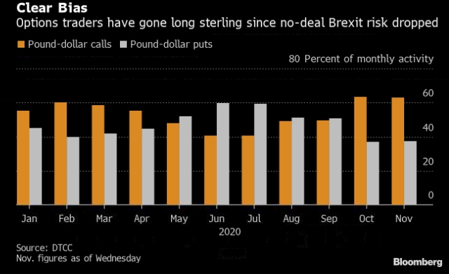 Ставки на укрепление фунта выросли до уровня, невиданного ранее в этом году, после того, как премьер-министр Борис Джонсон заключил в прошлом месяце сделку по Brexit и получил предварительное одобрение со стороны законодателей. Спрос на ванильные стерлинговыекол-опционы в октябре превышал спрос на путы на 50%. В течение первых девяти месяцев года он оставался практически идеально сбалансированным, свидетельствуют данные Депозитария Trust & Clearing Corporation.