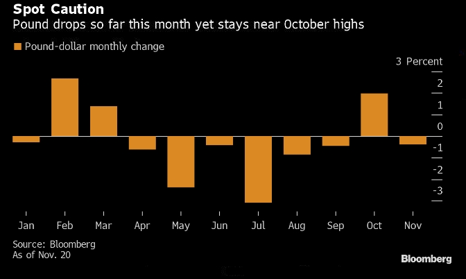 Средний прогноз опрошенных Bloomberg аналитиков предполагает, что по итогам года фунт стерлингов вырастет почти на 6% до $1.29. Валюта в четверг торгуется около 1.2940 доллара. В ноябре мало что изменилось после роста на 5.3% в прошлом месяце, который был самым большим с 2009 года. Безусловно, вялость фунта также имеет более прямую причину — валюта уже показала звездное ралли, поднявшись более чем на 8% от трехлетнего минимума сентября, и это означает, что большинство краткосрочных трейдеров, вероятно, пока удовлетворены доходностью.