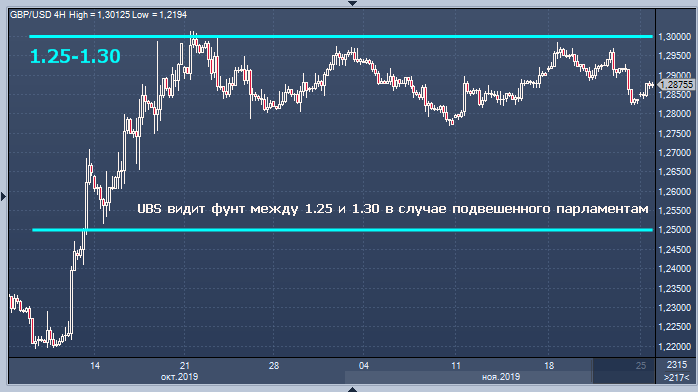 Стерлинг будет оставаться в диапазоне от 1.25 до 1.30 долл. США после всеобщих выборов в Великобритании 12 декабря в случае избрания так называемого «подвешенного» парламента, пока не появится некоторая политическая ясность, заявляет UBS Global Wealth Management.