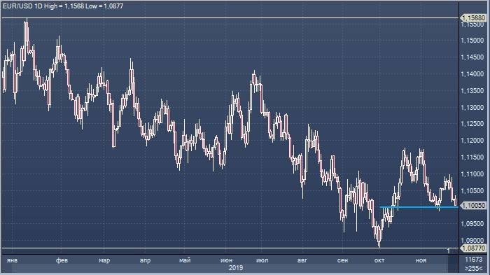 Доллар в понедельник, 25 ноября, продолжил укрепление против евро. Курс максимально приблизился к психологическому уровню 1.1000. Ниже этого уровня EURUSD не закрывался с 10 октября. Индекс S&P 500 сформировал новый абсолютный исторический максимум на уровне 3131.65 пункта. Доходность 10-летних казначейских облигаций упала на 1.2 базисных пунктов до 1.775%, а иена стала одним из главных аутсайдеров среди валют Большой двадцатки.
