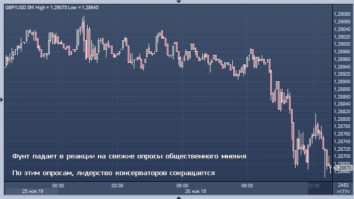 Фунт упал, так как опросы общественного мнения показали, что правящая Консервативная партия теряет голоса в преддверии выборов 12 декабря в Великобритании. Стерлинг упал на 0.2% до 1.2869 доллара США; ослабляется на 0.2% до 85.58 пенсов за евро.