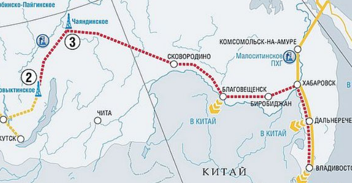 «Сила Сибири» - это построенный Газпромом требопровод длиной около 3 000 км, который протянулся от Чаяндинского и Ковыктинского месторождений до приграничного с Китаем Благовещенска. Еще одна труба длиной 3 370 км, подведенная к границе с противоположной стороны, идет на юг и соединяет «Силу Сибири» с Шанхаем.