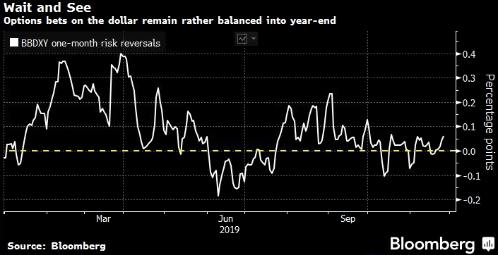 Растущее число аналитиков и инвесторов прогнозируют ослабление доллара, однако опционные трейдеры неохотно делают ставки против валюты США. Производные инструменты сигнализируют об улучшении перспектив доллара в краткосрочной перспективе: месячныериск-развороты по индексу Bloomberg Dollar Spot, премия по бычьим контрактам по сравнению с медвежьими, демонстрируют самый большой ежемесячный прирост с июля. Это контрастирует со средней оценкой в опросе аналитиков Bloomberg для американской валюты, согласно которым она ослабнет против большинства аналогов из Группы 10 ведущих валют.