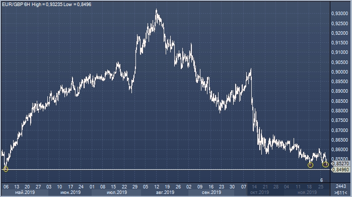 Фунт стерлингов обновил суточный максимум и установил новый экстремум текущей недели по отношению к валюте США. Курс фунт/доллар поднялся до 1.2927, при этом пара евро/фунт упала до 0.8520 повторно протестировав минимум 18 ноября. Ниже этой отметки котировки EURGBP последний раз могли быть замечены лишь 7 мая 2019 года.