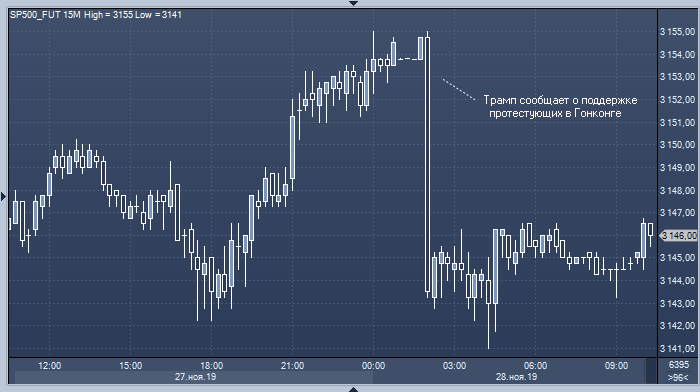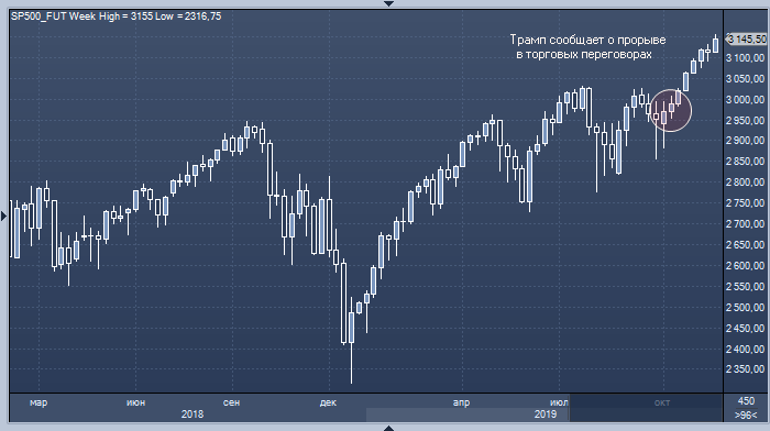Впрочем, довольно слабая реакция рынка на эти новости говорит о том, что инвесторы несильно обеспокоены перспективами срыва подписания торговой сделки между США и Китаем. Напомним, что 11 октября Дональд Трамп сообщил о прорыве в торговых переговорах и пообещал вскоре подписать первую фазу сделки. Тогда индекс S&P 500 находился в области 2950 пунктов и с тех пор, несмотря на то, что сделка так и не была подписана, вырос на 200 пунктов.