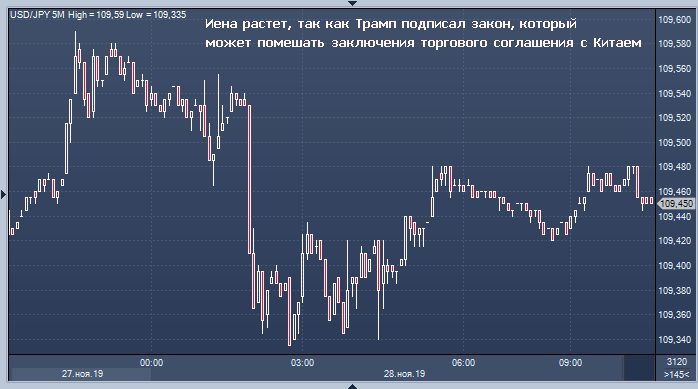 «Доллар понизился после того, как президент Трамп подписал законопроект о поддержке демократии в Гонконге, но он будет сохранять поддержку покупателей до тех пор, пока сохраняются надежды на подписание торговой сделки», — говорит Рюта Такетоми, менеджер по работе с клиентами в торговом офисе Resona Bank в Осаке.