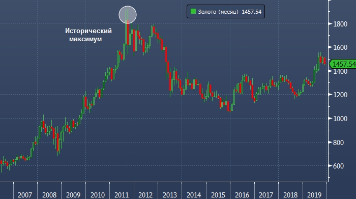 С начала 2019 года золото подорожало на 14%, однако остается на четверть ниже рекордных значений и торгуется чуть выше $1450 за унцию.