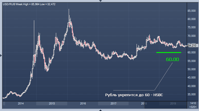 HSBC ждет укрепления рубля до 60 за доллар к концу следующего года на фоне ускорения темпов экономического роста в России и благоприятных структурных факторов, написали в обзоре Пол Макел и другие стратеги.