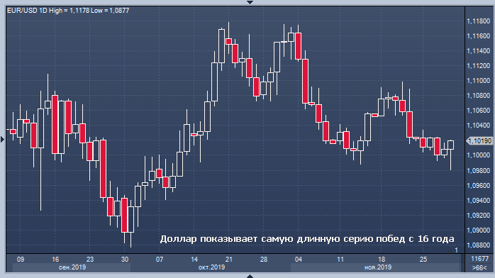 Доллар готовится продемонстрировать девятую подряд сессию роста. Это самая продолжительная прибыльная серия с января 2016 года. Инвесторы ждут новостей о прогрессе на переговорах между США и Китаем после недавнего усиления напряженности в связи законом США в поддержку протестующих Гонконга. Иена упала в пятницу, увеличив потери за месяц, которые делают ее одной из худших валют в ноябре в Группе 10 ведущих мировых валют.