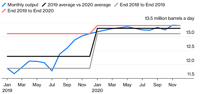 Разница возникает из-за того, что в 2019 году добыча росла стремительными темпами с 12.04 млн баррелей в день в декабре 2018 года до прогнозируемых 13.11 млн баррелей в декабре 2019 года. Учитывая то, что основная часть прироста пришлась на последние пять месяцев года, средний темп добычи в 2019 году, как ожидается, составит 12.29 млн баррелей в день.