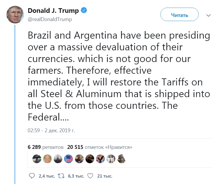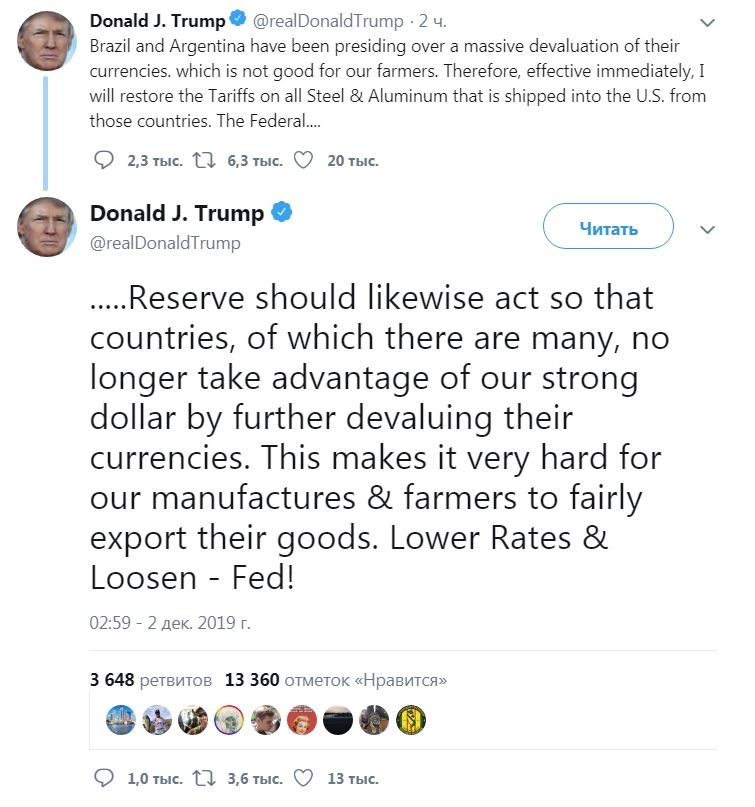 Связав свою торговую повестку дня с критикой ФРС в своем раннем утреннем твите, он сказал, что две южноамериканские страны «осуществляют массированную девальвацией своих валют, что вредит нашим фермерам. Поэтому — вступают в силу немедленно — я восстановливаю тарифы на сталь и алюминий, которые поставляются в США из этих стран».