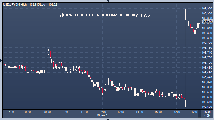 Курс доллара отскакивает от месячного минимума после того, как стало ясно, что экономика США в ноябре создала 266 тыс. новых рабочих мест, что превзошло медианный прогноз в 180 тыс., а показатель предыдущего месяца был пересмотрен вверх; уровень безработицы снизился до 3.5%, хотя средние часовые зарплаты не оправдали прогнозы. Индекс доллара Bloomberg растет на 0.2% после флета в преддверии данных по занятости в США. USD/JPY вырос на 0.1% до ~ 108.90. До выхода данных пара была на ~ 108.55. EUR/USD снизился на 0.3% до ~ 1.1074 против ~ 1.1096 перед цифрами.