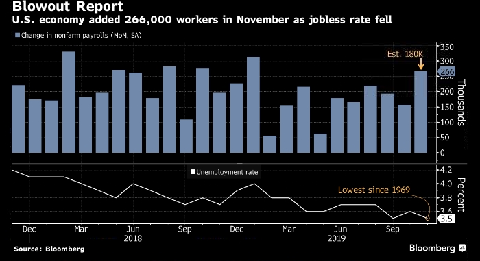 Число новых рабочих мест в экономики США выросло в ноябре, безработица достигла полувекового минимума, а заработная плата превысила оценки экспертов, что дает Федеральному резерву больше оснований для сохранения процентных ставок на стабильном уровне после трех сокращений в 2019 году. Отчет департамента труда, вышедший в пятницу, показал рост занятости на 266 000 рабочих мест, больше всего с января, после пересмотра с повышением роста до 156 000 в предыдущем месяце. Оценки в опросе Bloomberg предполагала рост на 180 000 рабочих мест.