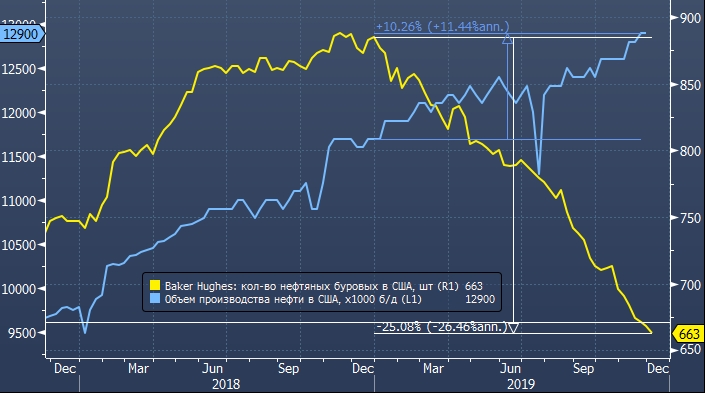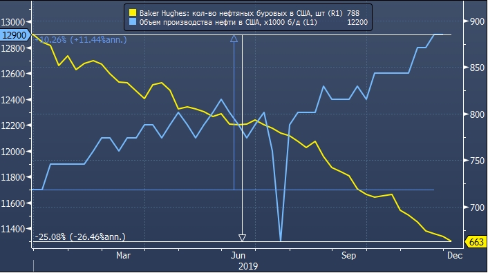 Таким образом, количество активных нефтяных установок упало до минимума с марта 2017 года. Показатель сокращается 7-ю неделю подряд. С начала текущего года количество нефтяных буровых уменьшилось на 25%, при этом добыча в США за тот же период выросла почти на 10% или 1.2 млн баррелей в день - то есть на величину сокращения добычи, которую с января согласовала группа ОПЕК+. Из 49 завершенных в 2019 г. недель количество нефтяных вышек в США продемонстрировало сокращение 39 раз - 79,56% прошедшего времени.