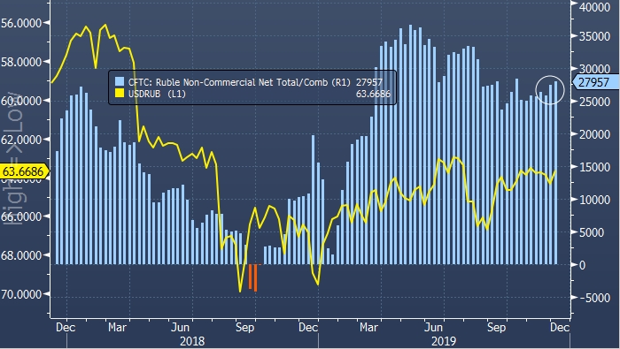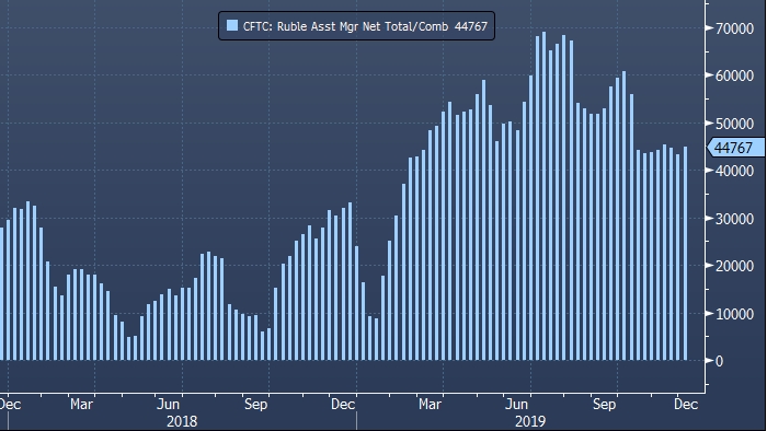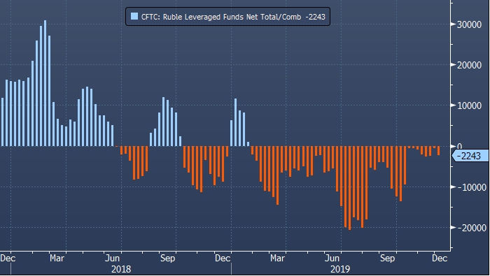 Если оценить статистику CFTC по рублю более подробно, то можно отметить, что сальдированная короткая позиция тех участников рынка, которые торгуют с кредитным плечом (leveraged funds) увеличилась за неделю на 1 604 до 2 243 контрактов. По меркам 2019 г. показатель по-прежнему остается незначительным.