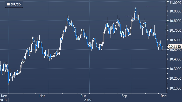 EUR/SEK растет в понедельник на 0.1% до 10.5182.