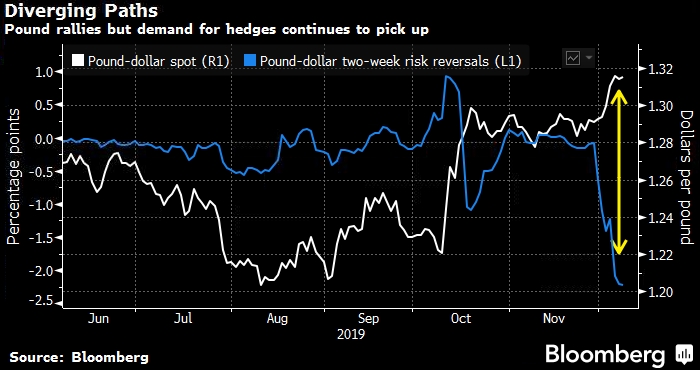 Тем не менее, стоимость хеджирования против падения фунта также выросла по мере того, как приближаются выборы, демонстрируя сохраняющуюся осторожность после того, как большинство опросов общественного мнения не смогли точно предсказать предыдущие выборы, такие как референдум по Брекситу 2016 года. Изменение двухнедельногориск-разворота показывает увеличение спроса на то, чтобы застраховаться от неожиданного результата голосования в четверг.