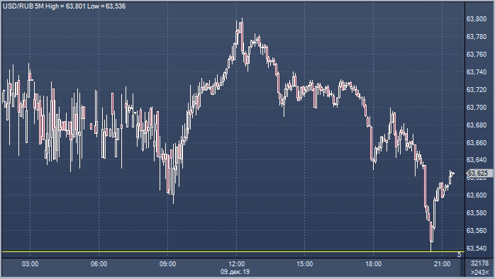 Курс рубля по отношению к доллару в понедельник большую часть торгового дня консолидировался в узком торговом диапазоне. Однако в вечерние часы пара USDRUB начала активно формировать нисходящее движение, в рамках которого был сформирован минимум 63.536 за единицу американской валюты.