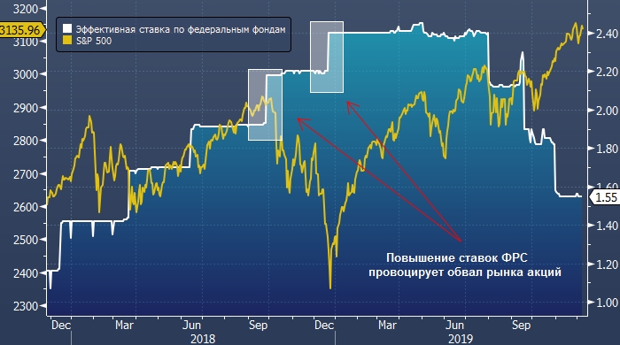 В прошлом сентябре и декабре ФРС повысила ставки, чем вызвала резкое снижение мирового рынка акций (см. график в начале статьи). Это заставило регулятор быстро пересмотреть свою политику уже в январе.
