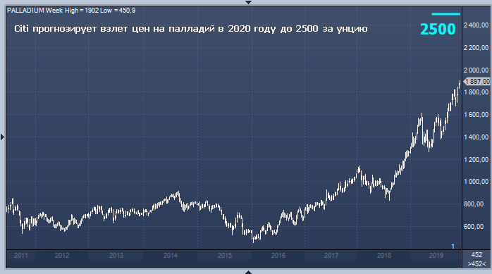 Citigroup Inc. ожидает, что цены на палладий подскочат до 2500 долларов к середине 2020 года из-за постоянного дефицита предложения.