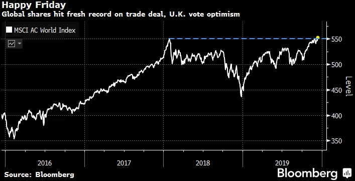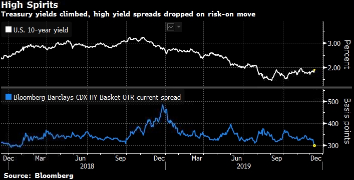 Рождество началось в прошлую пятницу фейерверком после отчета о занятости в США, который превзошел все ожидания. Затем, вечером четверга, в быстрой последовательности инвесторы получили известие о том, что оружие в торговой войны между США и Китаем будет зачехлено и что Британия вырывается из болота так называемого «подвешенного» парламента, когда ни одна из партий не имеет преимущества. Внезапно все опасения по поводу глобальной рецессии, еще одной волны повышения тарифов между двумя крупнейшими экономиками мира и жесткого разрыва Великобритании с Европейским союзом исчезают из поля зрения. Может быть странным, что это пятница,13-е, но те, кто сделал ранний старт, вроде JPMorgan Chase & Co., призывающие к покупкам рисковых активов в 2020 году, могут считать себя счастливчиками.