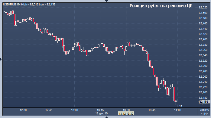 Российский рубль хотя и продолжил рост после решения ЦБ РФ снизить ключевую ставку на 25 базисных пунктов (б.п.) - до 6.25%, трудно отнести его на сторону тех или иных факторов. Дело в том, что рубль участвует в общемировом ралли, которое продолжается вот уже второй день. Конгресс отложил принятие так называемых «адских» (против госдолга) санкций против России, ФРС пообещала весь следующий год не повышать процентные ставки, Трамп сказал, что приблизился к промежуточной сделке с Китаем, а консерваторы одержали оглушительную победу в Британии. Все это взвинтило цены на рисковые активы по всему миру. К 13:51 мск курс доллара на торгах "Московской биржи" составлял 62.21 руб./$1, рубль прибавляет сегодня 0.8%. Евро опустился до 69.52 руб./EUR1, рубль укрепляется на 0.85%.