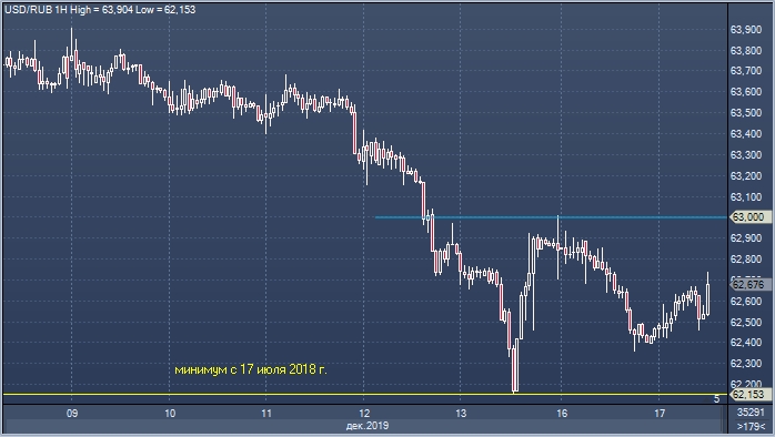 Рубль к доллару с начала 2019 г. укрепился более чем на 10%, что является лучшим результатом среди всех валют развивающихся стран. На предыдущей неделе курс доллар/рубль сформировал минимум на уровне 62.15. Это новый минимум 2019 г., а также лучшая цена российской валюты с 17 июля 2018 г.