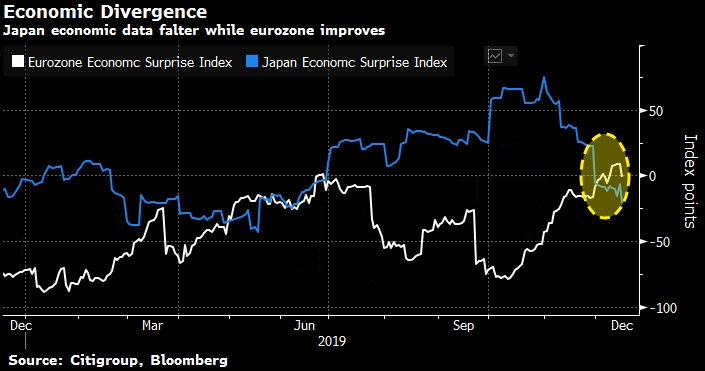 Франк вырос против иены на фоне расхождения экономических показателей между Европой и Японией. В то время как индекс экономической неожиданности Citigroup Inc. для еврозоны с октября растет, показатель для азиатской страны снизился, уменьшая перспективы нормализацииденежно-кредитной политики Банка Японии. В пятницу франк подскочил до восьмимесячного максимума в 111.78 иены после победы Консервативной партии на всеобщих выборах в Великобритании. Во вторник он был на 0.1% выше на 111.59 иен. Швейцарская валюта поднялась с минимума 106.74 иены в начале октября.