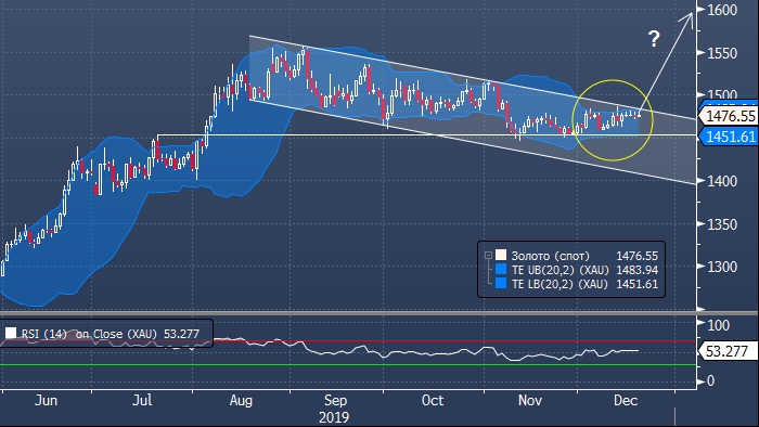 Техническая картина в ценах на золото характеризуется сужением волатильности. Сближение границ индикатора «конверт», построенного на основании 20-дневной скользящей средней указывает на всплеск волатильности в ближайшее время. Учитывая прочную поддержку на $1450 за тройскую унцию и нейтральное положение индикатора RSI, есть вероятность прорыва верхней границы канала, который формируется с августа. В этом случае золото выглядит способным подняться до $1600 за унцию — уровня, который последний раз наблюдался в апреле 2013 года.