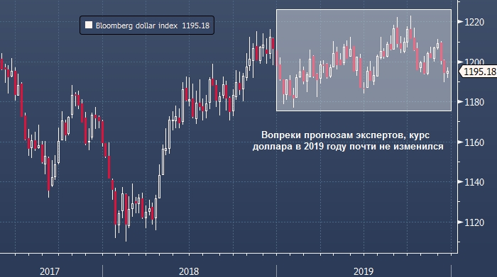 Год назад рыночные эксперты почти единодушно предсказывали заметное снижение курса доллара ввиду перспектив замедления экономики США и снижения высокого «carry» американских активов. Несмотря на это, индекс доллара, который рассчитывает агентство Bloomberg, за 2019 год почти не изменился.
