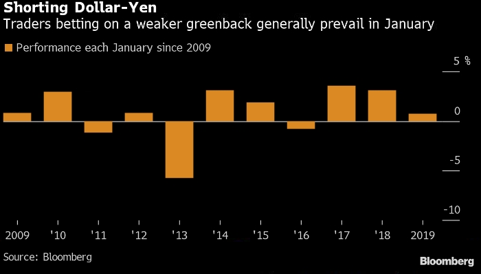 Для трейдеров, которые ориентируются на исторические закономерности в динамике основных валют, ставка на падение доллара по отношению к иене в январе может сработать, считает Карл Штайнер из шведского банка SEB AB. Трейдеры, делавшие такую ставку каждый январь начиная с 2009 года, имели восемь из последних 11 прибыльных лет. Если модель подтвердится, любое оживление доллара может быть продано, когда начнется 2020 год.