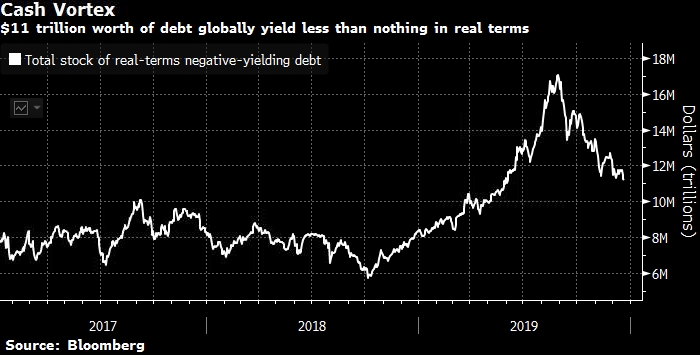 Экономические спады, как правило, приводят к снижению номинальных и реальных ставок, снижая альтернативную стоимость владения золотом, что рассматривается как хеджирование инфляции. С 1990 года корреляция металла на месячном графике с доходностью двухлетних облигаций Казначейства составляла -0.3. Хранилища слитков должны заполняться, поскольку отрицательные номинальные ставки повлияют на всех, от институциональных инвесторов до состоятельных частных лиц. Более 11 триллионов долларов долга концу 2019 года торговалось с реальной доходностью ниже нуля.