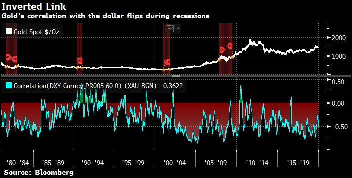 У доллара сильное влияние на золото — это два часто двигаются в противоположных направлениях инструмента. Регрессионный анализ показывает, что около четверти недельных колебаний цен на металл с 2001 года может быть обусловлено торгово-взвешенным индексом долларом. Команда Markets Live ждет ослабление доллара в следующем году. Но даже устойчивый доллар может не остановить ралли золота в 2020 году. Во время спада оба актива могут действовать как защитные. Обратная корреляция между ними нарушалась во время или сразу после каждой рецессии с 1981 г.