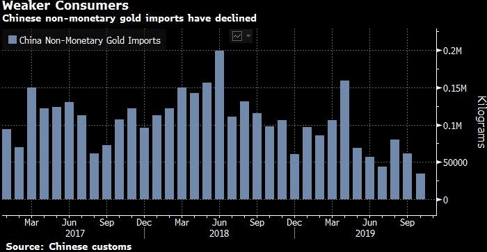 Конечно, спрос со стороны некоторых потребителей пострадает по мере роста цен. Мировые закупки ювелирных изделий в первые три квартала 2019 года упали на 5% до 1521 тонны, согласно данным Metals Focus. Растущая экономическая грамотность и вариативность могут также повлиять на использование золота в качестве средства сохранения стоимости (накопления богатства) на Индийском субконтиненте. Китайский импорт физического золота замедляется. По данным китайской таможни, он упал на 40% с 2019 по октябрь по сравнению с уровнем годом ранее. Это отражение негативного влияния торговой войны.