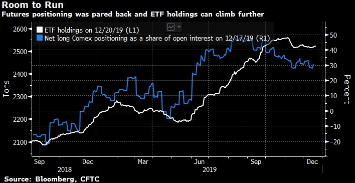 Но потребители менее важны в определении цены, чем потоки инвесторов в ETF и фьючерсах. На них, наряду с курсом доллара и краткосрочными ставками в США, приходится три четверти формирования ценового движения золота, согласно многомерному анализу, рассчитанному ежемесячно за последние два года. После краткого превышения в начале 2019 года спекулятивный навес золота опустился с почти 50% до примерно 30%, что определяется в виде чистых длинных позиций на Comex как доли открытого интереса. То есть имеется пространство для восстановления этого навеса в 2020 году.