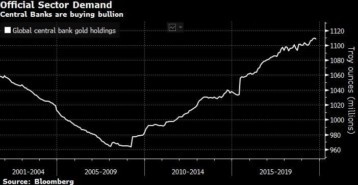 Спрос центральных банков оставался высоким в 2019 году и должен приблизиться к уровню в 650 тонн, достигнутому в 2018 году, что является самым высоким с тех пор, как Никсон разорвал привязку доллара к золоту. Спрос будет поддерживаться растущим желанием диверсификации и уходом от доллара, так как США ослабляют международные связи, санкционируя другие страны или ограничивая доступ к долларовому финансированию.