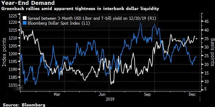 Индекс Bloomberg Dollar Spot мало изменился и находится на пути к тому, чтобы показать второй год роста подряд, на сей раз поднявшись на 0.2%. Доходность 10-летних казначейских облигаций упала на 1 б.п. до 1.92% и снизилась до 76 б.п. в этом году; торговля UST заканчивается в 14:00 по восточному времени. Рынки могут получить следующий сигнал из данных по заявкам на пособие по безработице в США, которые выйдут в четверг. NZD/USD упал на 0.2% до 0.6626 после ралли до максимума почти за пять месяцев в понедельник; пара снизилась на 1.4% в этом году.