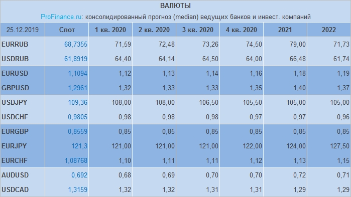 Рубль, как ожидается, в целом будет стабилен к доллару, но постепенно ослабнет к евро. Следует напомнить, что волатильность валютных курсов в 2019 г. достигла рекордных минимумов, что отражается на прогнозах, которые турбулентности среди валют в 2020 году не ожидают. Хотя в ноябре наступающего года в США пройдут президентские выборы, к следующему декабрю Великобритании нужно успеть согласовать с ЕС торговое соглашение, а окончательная сделка США и Китая еще не подписана.