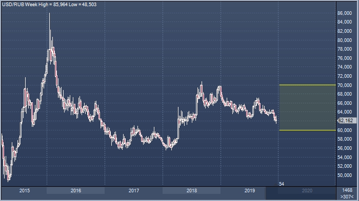 У рубля есть шансы продолжить рост в 1-м полугодии на фоне сезонно сильного счета текущих операций, прогнозируют аналитики Промсвязьбанка. Они ожидают уход пары USDRUB к нижней границе диапазона 60.00–62.00 К середине 2 квартала, предполагая при этом, что в середине года российская валюта вновь начнет слабеть и средний курс по итогам 2020 года составит 64–65. В котировках рубля нет премии за возможные санкции, поэтому возвращение актуальности темы санкций приведет к увеличению волатильности рубля, отмечают в банке.