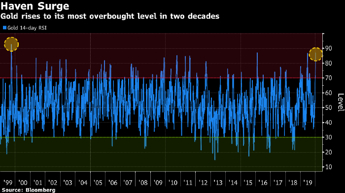 В результате недавнего роста главный драгметалл оказался наиболее перекупленным за последние 20 лет. По данным Bloomberg, 14-дневный RSI сегодня достиг отметки 87.